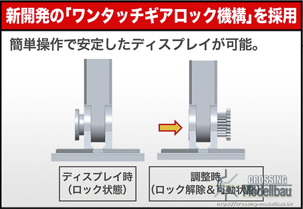 This base features a one-touch locking gear mechanism for easy use and stable display!