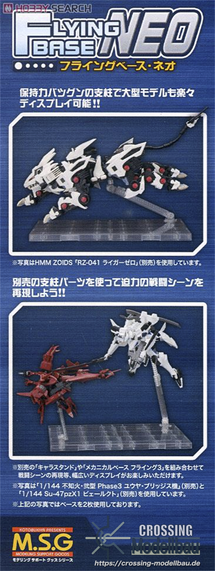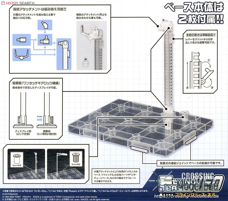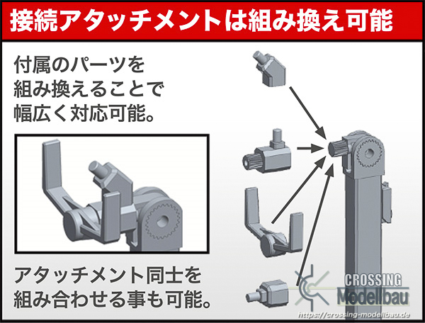 Attachments that are compatible with separately sold bases such as CHARA STAND, NEW FLYING BASE and HEXA GEAR MINI FLYING BASE are also included, providing multiple customization options for users to enjoy.