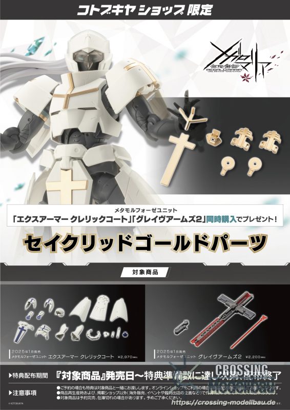 Grave Arms2 is a combination weapon resembling a cross. While the primary weapon is a giant cannon, it also acts as a large sheath for a laser blade and dual handguns. In addition to transforming into a large sword, the grip can be removed attached to the included effect parts to create a deadly laser blade sure to liven up any heroic action scene. The weapon can also be mounted to various places using the articulated mounting arm.