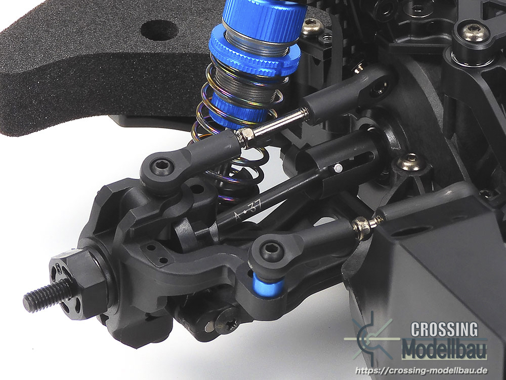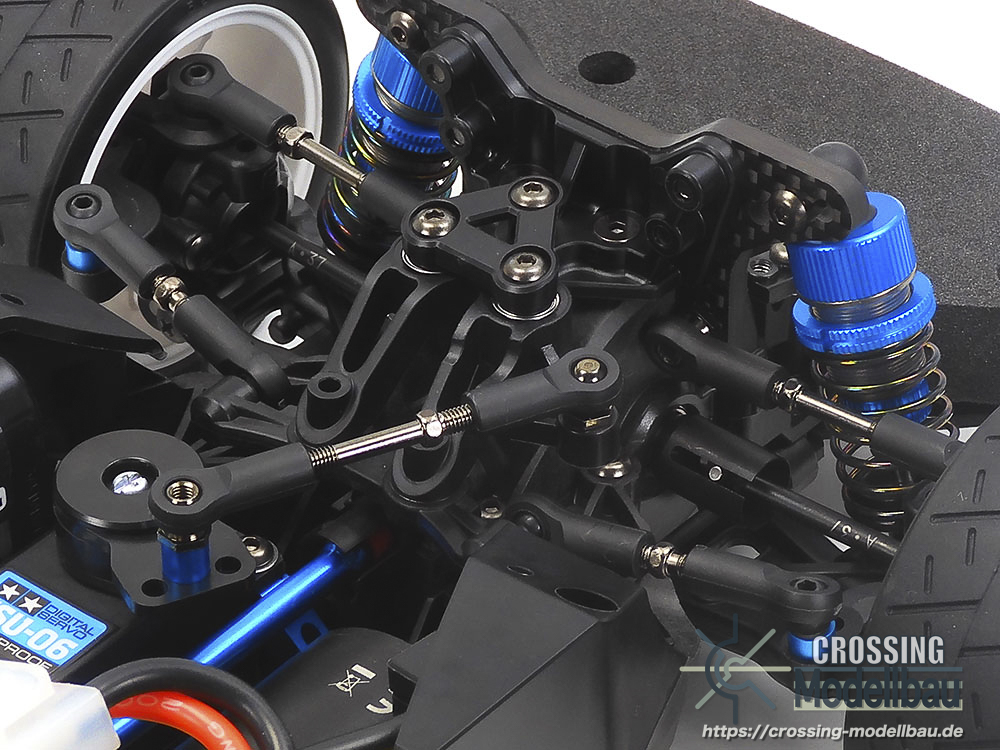 – Features aluminum-cylinder oil dampers employing shaft length suited for on-road performance, and dedicated 3.5mm thick carbon fiber damper stays, and carbon fiber-reinforced rigid lower deck.